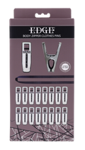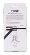 Submit to sensation. Suffer in sequence. The Edge® Body Zipper Clothes Pins turn control into artful cruelty. Sixteen silver-plated clamps await your command, ready to fasten to flesh and link through a heavy-duty 96-inch flat cord. Thread the cord through each clamp, then pull to zip, each motion tugging at the body in a slow, merciless wave of pressure that blurs the line between pain and pleasure. Silicone-lined interiors ensure a secure bite that holds until release. Finished in polished silver-plating with the Edge logo engraved on both sides, this set delivers portable, precision-built domination. Travel-friendly and ready for any scene.