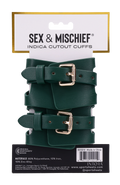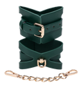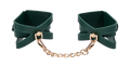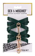 Surrender in style. The Indica Cutout Collar wraps the neck in rich emerald green with luxe gold hardware and sensual cutout accents that expose just enough skin. Lined for comfort, this collar is a soft but striking symbol of submission—an invitation to give in and give over. The coordinating gold chain leash with green handle lets your dominant guide the pace, whether you’re at home or on display. Pair with the Indica Cutout Cuffs for a beautifully bound look.
