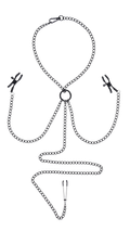 Ignite your passions and take intimacy to sensational new heights with the Saffron Nipple to Clit set. Perfectly crafted for use both in and out of the bedroom, feel the illustrious black chains drape down your body from the connected chain collar. Tease yourself with attached nipple clamps to add pressure and arousal to your most sensitive areas while a third tweezer clamp stretches down to your clit for tantalizingly seductive tension. Perfect to create heightened experiences during sensation play or as a playful reminder of your submissive place as its worn under your clothes. Secure and comfortable, the Nipple to Clit Set allows you to reign in your pleasure however you like as they tug and tease with every movement.